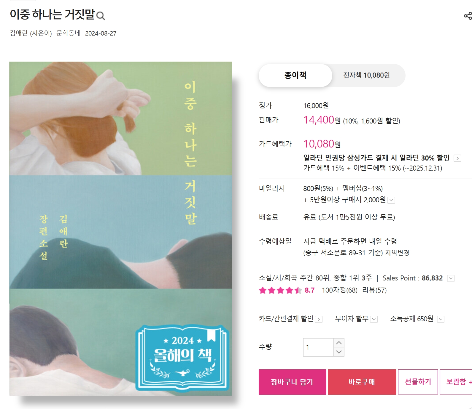 『이중 하나는 거짓말』은 한국 현대 문학을 대표하는 작가 김애란의 최근 소설집으로, 출판사는 문학동네입니다.